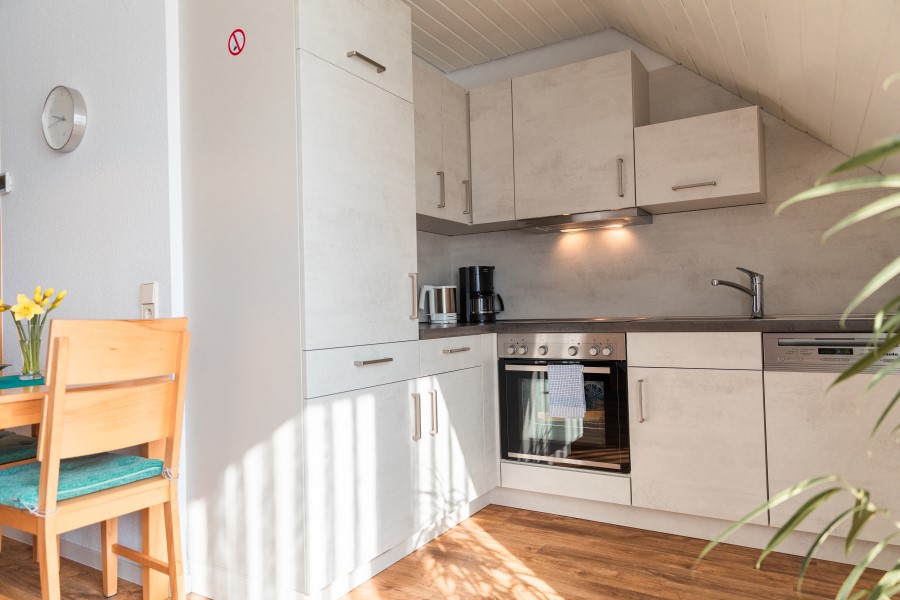 Die in den Wohnraum integrierte Küche ist mit Elektroherd, Backofen, Kühlschrank, Spülmaschine, Kaffeemaschine (Filter oder Pad), Toaster, Heißwasserkocher und ausreichend Geschirr ausgestattet.