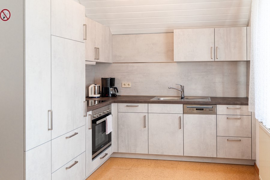 Die in den Wohnraum integrierte Küche ist mit Spülmaschine, Elektroherd, Backofen, Kühlschrank, Kaffeemaschine (Filter oder Pad), Toaster, Heißwasserkocher und ausreichend Geschirr ausgestattet.