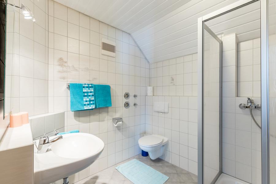 Das Badezimmer verfügt über Dusche, Waschbecken und WC.